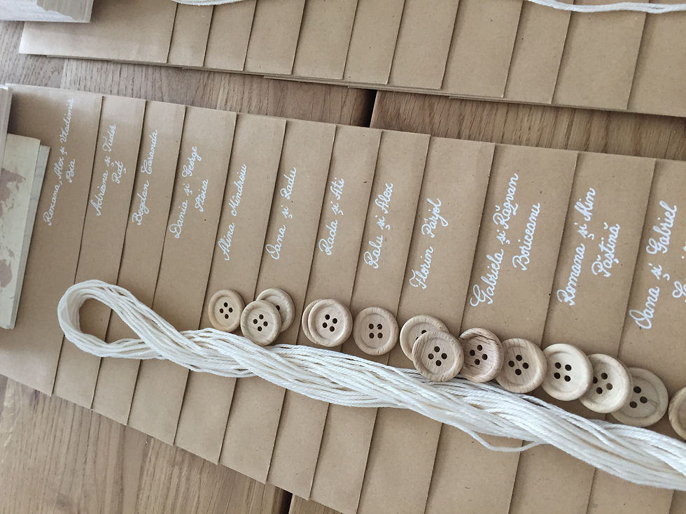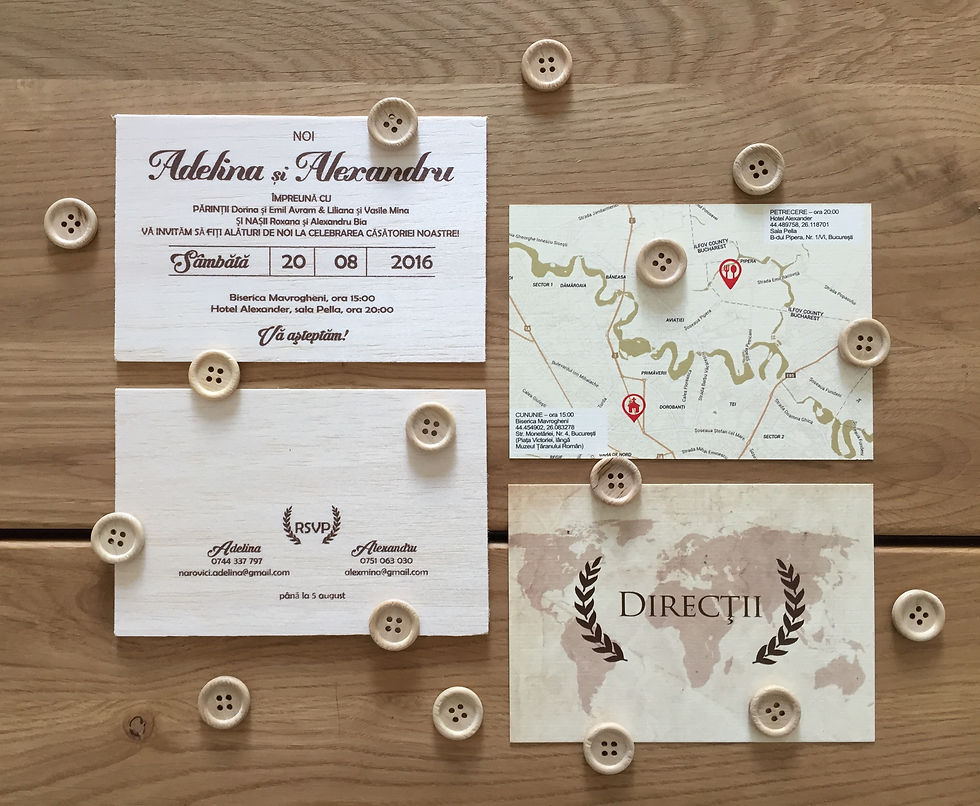 Am facut asa: invitatii printate cu maro pe lemn, carduri cu harta locatiilor pe carton texturat cu aspect vintage, toate aceste intr-un plic kraft. Ei au decis sa isi puna amprenta si au adaugat un nasturel tot din lemn legat cu sfoara. Rezultatul final este wooow. Impresionant!